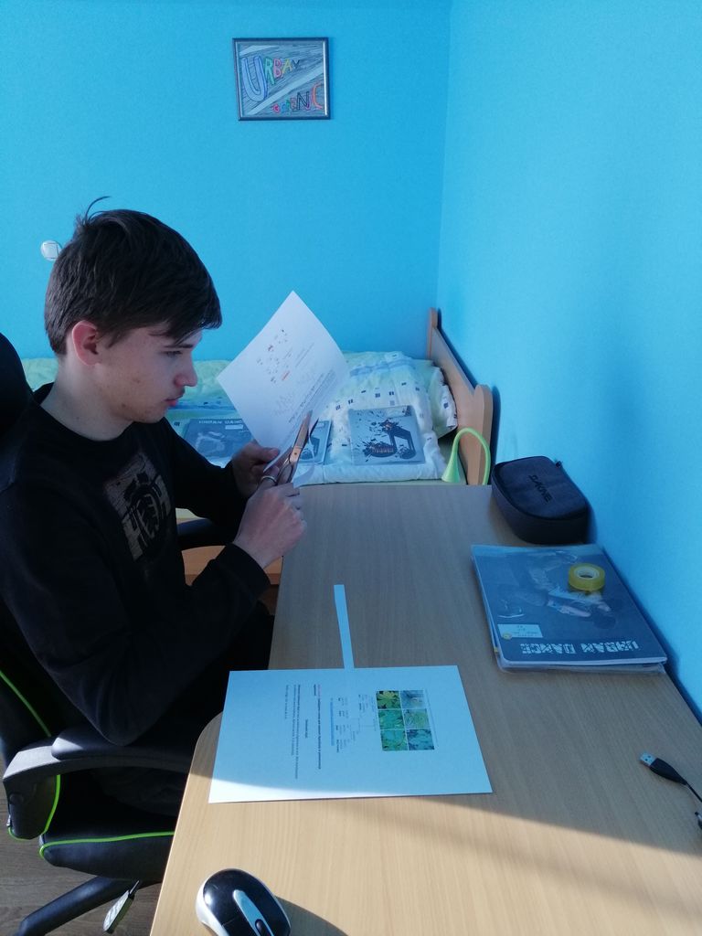In kako poteka moja šola na daljavo? Tako, da se med tednom zbudim ob sedmi uri, pojem zajtrk, se umijem, oblečem, nato računalnik in gmail, telefon in eAsistent ter čakam na naloge in spletno učilnico. Prav lepo je videti sošolce preko zooma, čeprav tako na daleč. Večino šolskega dela opravim dopoldne, če mi kaj ostane, pa naredim še popoldne. Imeli smo športni dan – čistilna akcija okoli hiše in naravoslovni dan – nabiranje regratovih cvetov. Pri likovnem pouku smo naredili avtoportret in oblikovali človeka iz različnih materialov – jaz sem uporabil žico in rafijo. Pri ostalih predmetih nam učiteljice in učitelj pošljejo gradivo, ki si ga bodisi natisnemo ali prepišemo, in naloge, ki jih vestno opravljam. Moram priznati, da imam sedaj več časa za druženje s starimi starši in mami, ko ni v službi, sem ogromno na zraku, pomagam pri domačih opravilih, tudi posodo večkrat pomijem. Naredim si večerjo, tudi snežno kepo ali dve sem naredil, saj nas je sneg prav lepo presenetil. Počnem vragolije s kolesom, gledam TV, tipkam po telefonu in računalniku ter seveda moje najljubše opravilo – poslušanje glasbe. Opravil sem tudi 14-dnevni bralni izziv Knjižnice Trebnje, ampak kljub vsemu zelo pogrešam družabno življenje z vrstniki.