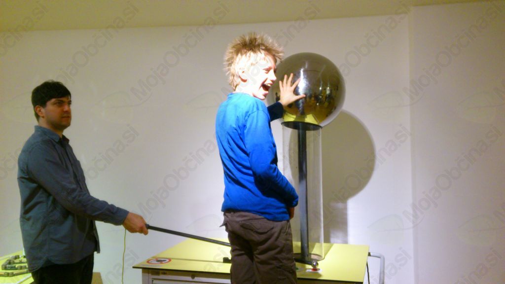 V zgradbi sta nas pričakala prijazna vodiča. Najprej smo se pozdravili in razdelili v dve skupini. Naš razred je gospod popeljal v kletni prostor, kjer je bilo vse pripravljeno za izvajanje poizkusov. Gospod nam je podal navodila in nas pustil, da smo dvajset minut samostojno eksperimentirali. Nato smo še skupaj izvedli nekaj poizkusov ob razlagi. Najbolj smo se nasmejali ob kovinski krogli, ki nam je ob dotiku z dlanjo naše telo tako naelektrila, da so se nam dvignili lasje. Tudi jaz sem jo preizkusila in bila sem zelo smešna. Ogledali smo si tudi, kako nastajajo umetne strele. Naprava je bila precej glasna. Trije so držali žarnice in ko je gospod vključil napravo, so iz manjše kovinske krogle švigale strele.