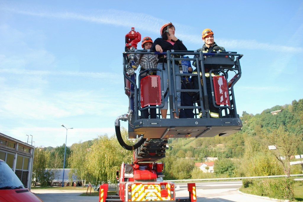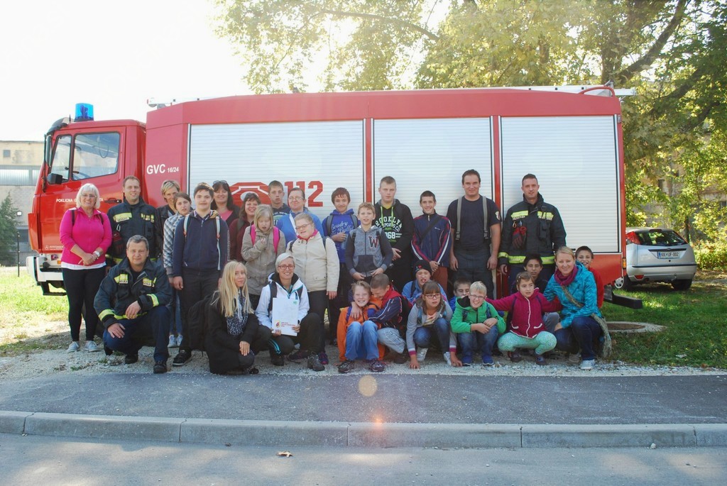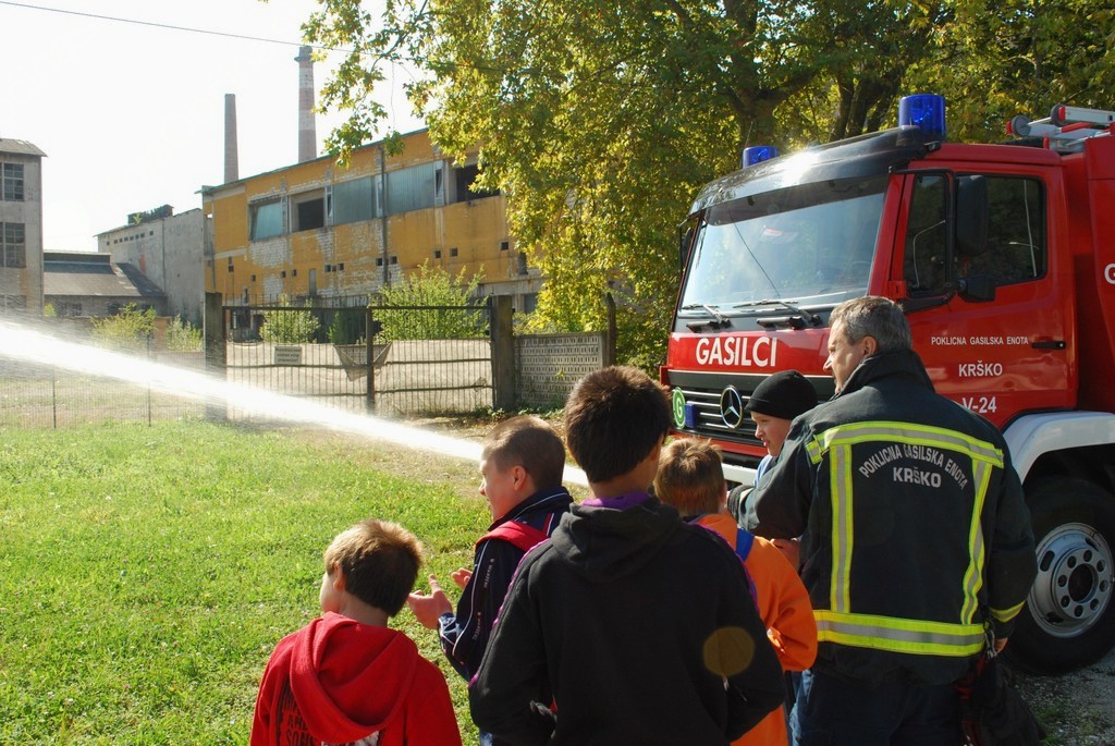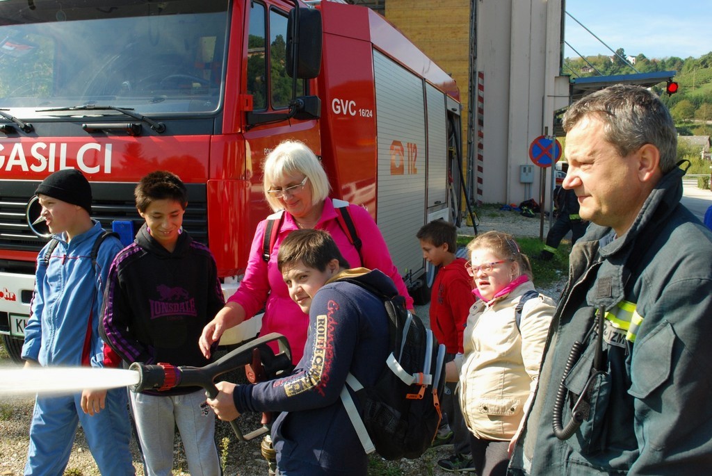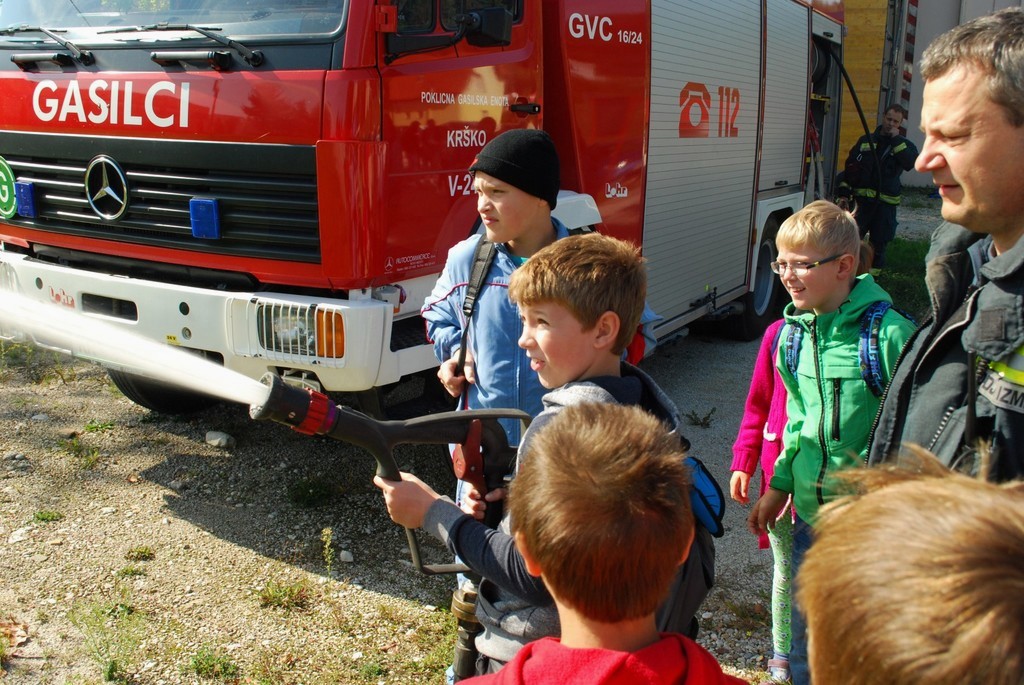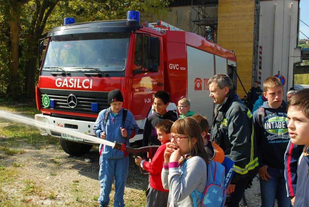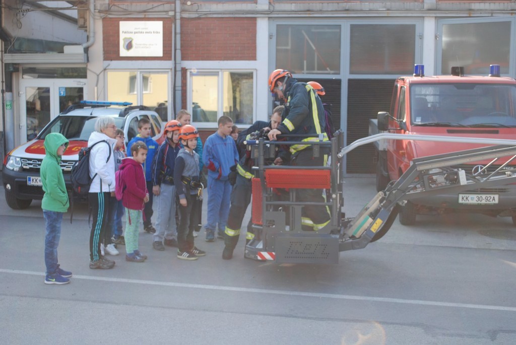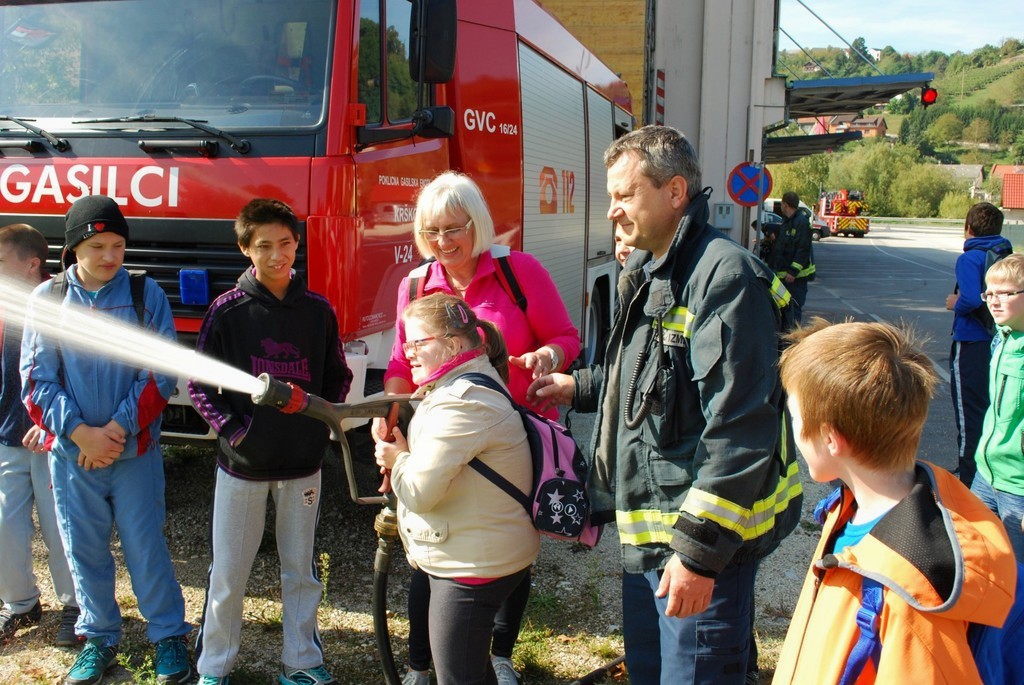 Prva skupina si je najprej ogledala vozni park – gasilska vozila, opremo in pripomočke, s katerimi upravljajo ob prometnih nesrečah, požarih in drugih intervencijah. Medtem pa si je druga skupina že privoščila malo adrenalinsko dejavnost – dvig z avto lestvijo na približno 15 m višine. Ko smo vsi zaključili s prvotno dejavnostjo, smo skupine zamenjali. Po prvem delu smo nato malo pomalicali, nato pa si ogledali spust gasilca po vrvi iz stolpa. Naučili smo se, kako zelo pomembna je zaščitna in varnostna oprema. Po prikazu spusta iz stolpa pa smo lahko še malo pogasili navidezni požar, ob tem pa ugotovili, da morajo biti gasilci zelo močni, saj so najmlajši učenci potrebovali pomoč gasilca, da so lahko cev z ročnikom sploh obdržali v rokah.