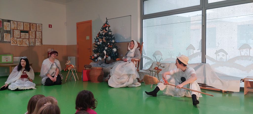 Med nežnim plesom Snežink in zabavnim plesom Snežaka, ki je svoj nos nosil kar v roki, se je prostor napolnil s čarobnostjo. Ob toplem kaminu je babica Zima otrokom prebrala pravljico Kako sta Bibi in Gusti sipala srečo. Pravljica govori o dveh pujskih, ki imata v prazničnem decembru veliko dela, saj morata do ljudi pravočasno prinesti najmehkejšo in najčistejšo srečo.