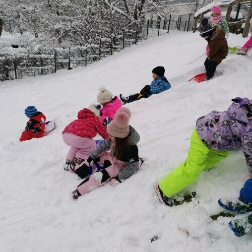 Največ veselja je otrokom prinesel sneg. Zasneženo igrišče jih je takoj spodbudilo h gibanju, raziskovanju in igri. Navdušeno so se spuščali z lopatkami in bobi po belih strminah. Smeh, rdeča lička in razigranost so pokazali, kako pomembna je prosta igra v naravi.