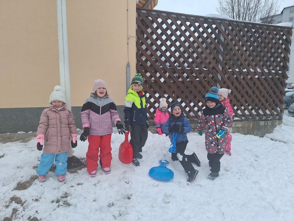 Po dolgem času je naše kraje razveselila obilna snežna odeja, ki je v vrtcu pričarala pravo zimsko pravljico. Otroci so s sijajem v očeh in širokimi nasmehi pozdravili sneg, ter se navduševali, da ga je tako obilno zapadlo. Veselje je bilo nepopisno, saj je sneg ponudil nešteto priložnosti za igro, raziskovanje in gibanje na prostem. Najprej so radovedno opazovali sledi v snegu – ugibali so, kdo ali kaj jih je pustilo, ter primerjali odtise čevljev, škornjev in živalskih tačk. Kmalu so začeli ustvarjati tudi svoje sledi, hodili, tekli in skakali so po svežem snegu. Se vanj tudi ulegli. Z zanimanjem so opazovali, kako se sneg spreminja pod njihovimi koraki. Všeč jim je bilo, ko so se lahko vrgli v sneg in se drčali po različno strmih hribčkih. Z lopatkami so očistili sneg z vrtčevske terase. Seveda pa ni manjkalo tudi kepanje, polno smeha in razigranosti. Dobro so »nakepali« tudi vzgojiteljice.