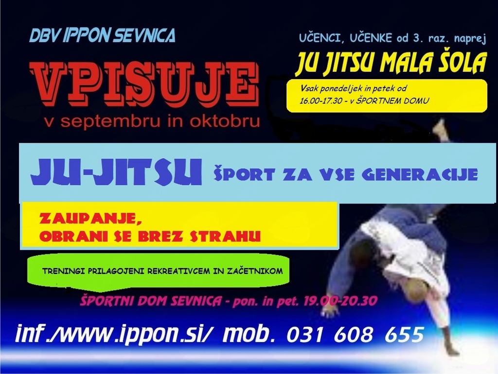 Društvo borilnih veščin IPPON Sevnica, društvo z dolgoletno tradicijo izvajanja programa na področju športa borilnih veščin, tudi letos vabi mlade v malo šolo ju jitsa. Mladi bodo lahko razvili in izboljšali osnovne motorične sposobnosti, utrdili samozavest in samodisciplino. Z njimi bodo na vadbi izkušeni trenerji in vaditelji z licenco oz. ustrezno izobrazbo na področju športa. Bolj samozavestni in želeči tekmovanj se bodo lahko pripravili in udeležili tekmovanj v športnem ju jitsu doma in v tujini. Pridružili se bodo našim že uspešnim in priznanim športnikom, nosilcem medalj z državnih, evropskih in svetovnih prvenstev.