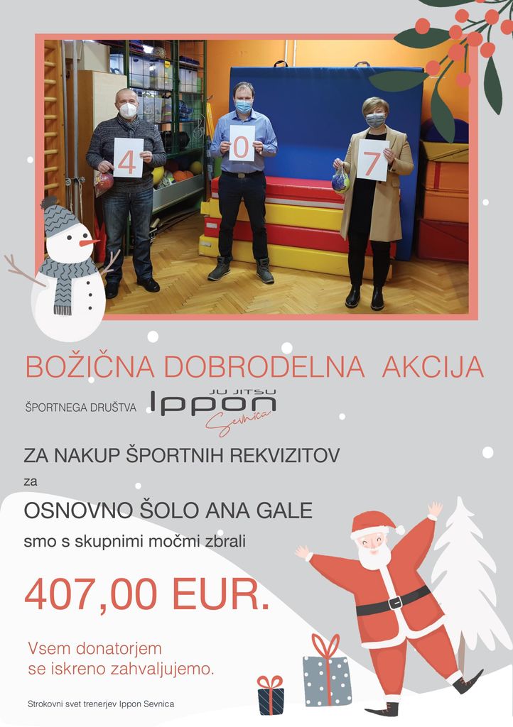 Strokovni svet trenerjev v DBV Ippon Sevnica se močno zaveda, da trenutne razmere niso prijetne za mlade v športu. Odločili so se, da z dobrodelno akcijo skupaj z Božičkom nekoliko omilijo neprijetno stanje z nakupom »elektronskega tapkalnika« in drugih pripomočkov, s katerimi se bo povečala kakovost športne vadbe.