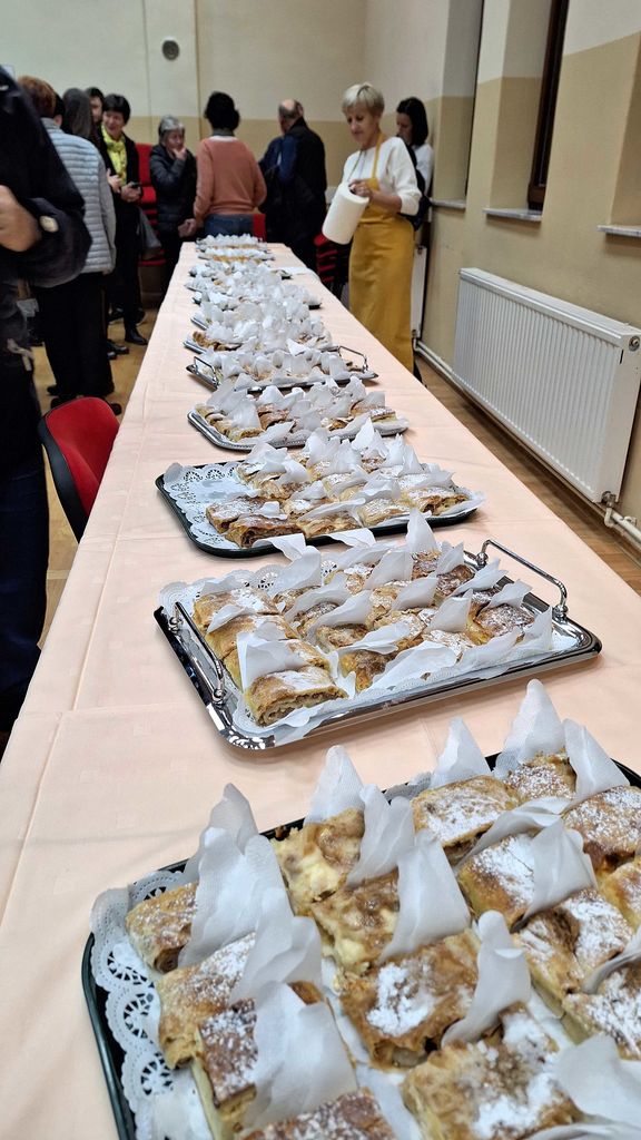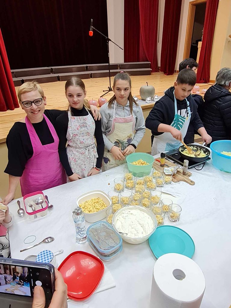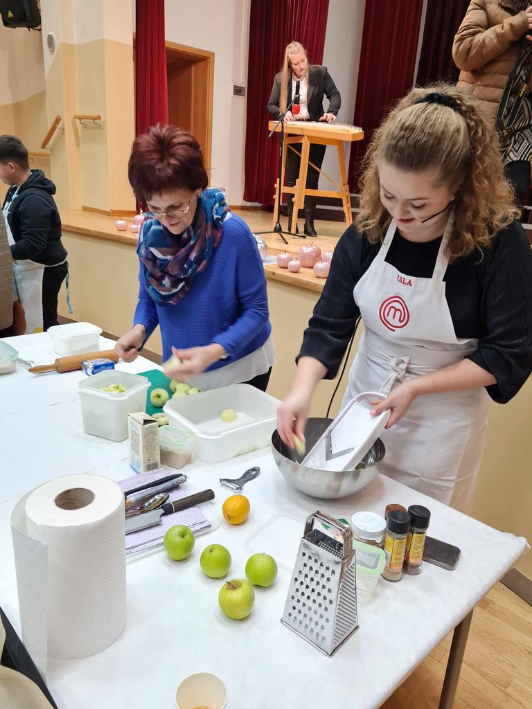 Turistično društvo Boštanj že devet let zapored prireja Mišjakov večer, ki je vsako leto zaznamovan z drugo tematiko. Letos smo se odločili, da pripravimo večer jabolčnih štrudljev. Boštanj je znan po svoji boštanjski voščenki in tako smo dobili idejo ter ljudi povabili na štrudelj. K sodelovanju smo povabili vseh 11 aktivov kmečkih žensk, ki delujejo v občini Sevnica. Tako je vsako društvo pripravilo enega ali več jabolčnih štrudljev in tudi člani TD so spekli svoje. Večer pa smo popestrili z gostjo Zalo Pungeršič, zmagovalko šova Master chef Slovenija 2023, in otroki 7. in 8. razreda, ki obiskujejo predmet Sodobna priprava hrane, da so pripravljali svoj štrudelj. Zala Pungeršič je pripravljala klasičen štrudelj, učenci Zoja, Sara in Anej pa štrudelj v kozarcu. Program je povezoval Ciril Dolinšek, po začetni glasbeni točki citrarke Lane Žužek je lepo vpletel v pogovor tudi predstavitev dela Zale in otrok. Program so popestrile Ljudske pevke s Telč, vse zbrane je nagovoril novi predsednik društva Andrej Golčnik, ki je tudi župnik v Boštanju. Med pripravo štrudljev so obiskovalci pokušali vse, ki so jih pripravile članice aktivov, žejo pa so si gasili s kuhanim jabolčnikom. Za konec smo lahko poskusili sodobno izvedbo štrudlja v kozarcu in sveže pečenega, ki ga je pripravila zmagovalka Zala.