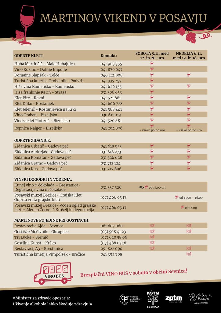 Obiščete jih lahko v lastni režiji, z lastnim prevozom, kolesom ali kar peš. V Sevnici bo v soboto med sodelujočimi vinarji vozil brezplačni VINObus (krožna trasa Doživljaj, Glavni trg-Vino Kozinc-Huba Martinčič-Domaine Slapšak-Hiša vina Kamenško-Turistična kmetija Grobelnik).