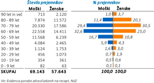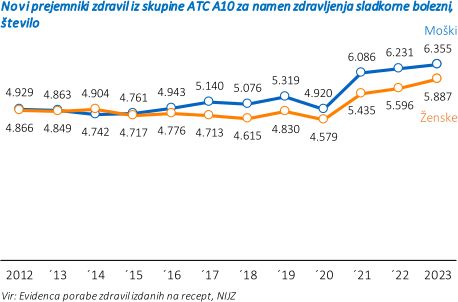 Na letni ravni spremljamo število oseb, ki so v tem koledarskem letu prejele zdravila za zniževanje glukoze; zanje domnevamo, da jih jemljejo zaradi sladkorne bolezni, razen v primerih, ko prejemajo le zdravila iz skupine agonistov receptorjev GLP-1 (A10BJ) ali zaviralcev SGLT2 (A10BK), saj se ti skupini uporabljata tudi za zdravljenje drugih bolezni, praviloma pa nista skupini izbora na začetku zdravljenja sladkorne bolezni. Teh oseb je bilo v letu 2023 126.786, kar je za 3.332 več kot v letu 2022, za 8.571 več kot v letu 2020 ter za 34.346 več kot v letu 2010. Med prejemniki je 69.143 moških in 57.634 žensk.