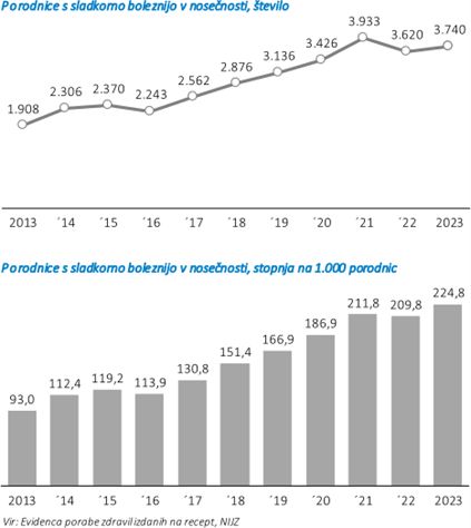Porodnic s sladkorno boleznijo v nosečnosti je bilo v letu 2023 3.740, kar je za 120 več kot v letu 2022, za 193 manj kot v 2021 in za 1.832 več kot v letu 2013. Število, izraženo na 1.000 porodnic, je v letu 2023 224,8, v letu 2022 je bilo 209,8, v letu 2013 pa 93,0. Število samo po sebi in število, izraženo glede na 1.000 porodnic, sta do leta 2021 strmo naraščali. V Sloveniji so se diagnostični kriteriji za diagnozo sladkorne bolezni v nosečnosti znižali z objavo strokovnih smernic v letu 2011.