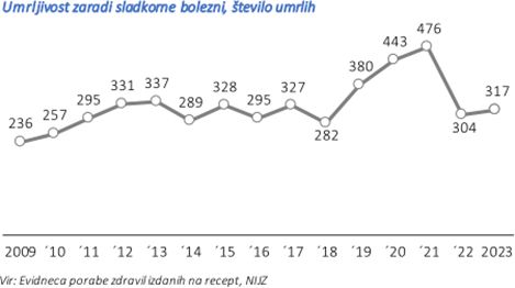 V letu 2023 je zaradi sladkorne bolezni kot osnovnega vzroka smrti umrlo 317 ljudi (v letu 2020 443, v letu 2014 289 in v letu 2010 257). Standardizirana stopnja umrljivosti v Sloveniji zaradi sladkorne bolezni kot osnovnega vzroka smrti je 13,6 (v letu 2020 20,1, v 2014 15,2, v 2010 14,3).