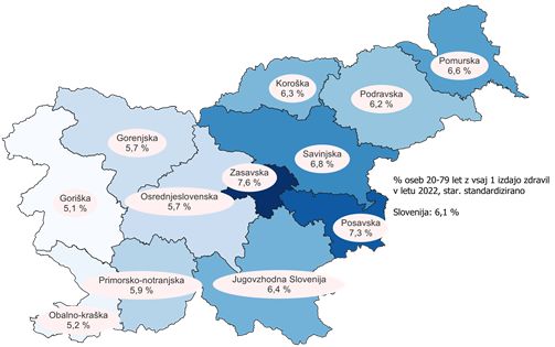 Med prebivalci Slovenije, starimi med 20 in 79 let, je 6,2 % (starostno standardizirana prevalenčna stopnja) takšnih, ki so leta 2022 prejeli zdravila za zniževanje glukoze, pri čemer se delež med posameznimi regijami razlikuje – od 5,1 % v Goriški do 7,6 % v Zasavski regiji.