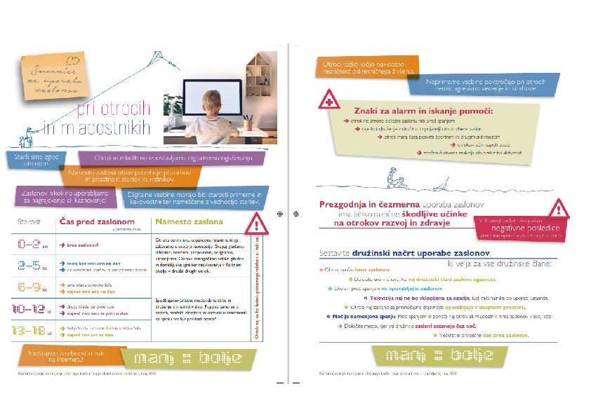 Vsa priporočila za uravnoteženo uporabo zaslonov, povezave do kakovostnih spletnih vsebin, povzetke za starše in kontakte v primeru težav najdete na spletni strani: https://www.nijz.si/sl/smernice-za-uporabo-zaslonov-pri-otrocih-in-mladostnikih.