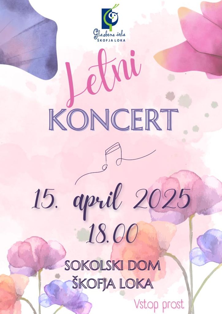 Vabljeni na letni koncert učenk in učencev Glasbene šole Škofja Loka, ki bo v torek, 15. aprila 2025, ob 18.00 v Sokolskem domu Škofja Loka.