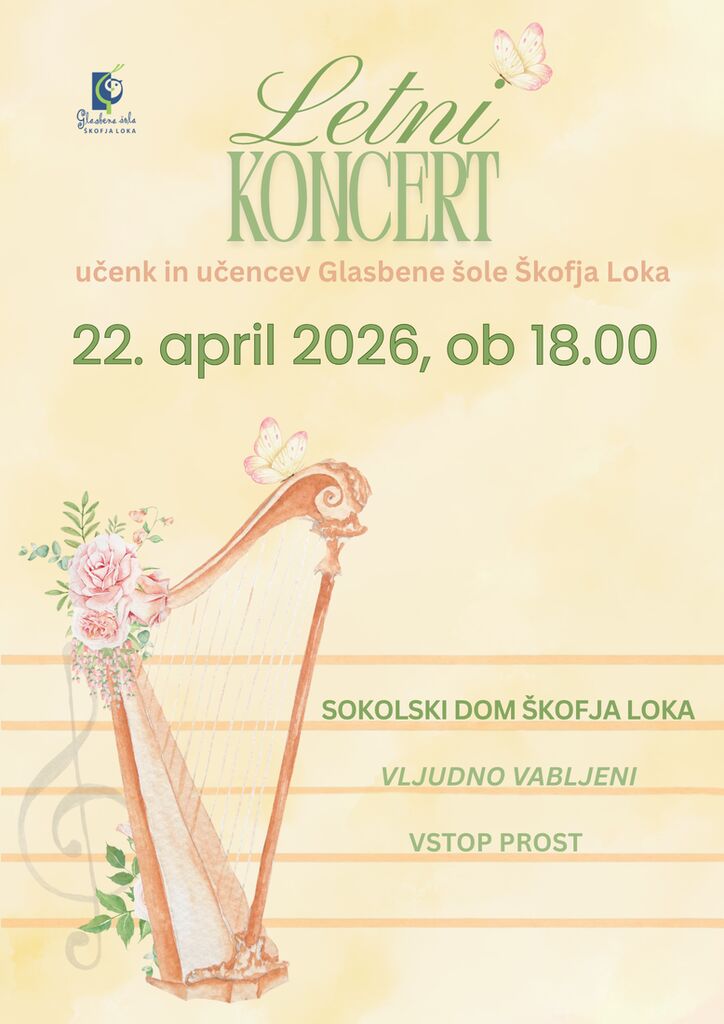 Vabljeni na letni koncert učenk in učencev Glasbene šole Škofja Loka, ki bo v sredo, 22. aprila 2026, ob 18.00 v Sokolskem domu Škofja Loka.