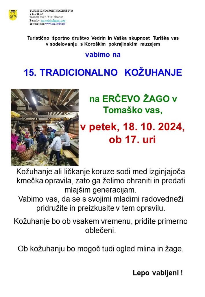 Vedrinovci vas skupaj s Koroškim ppkrajinskim muzejem in Vaško skupnostjo Turiška vas vabimo na 15. tradicionalno kožuhanje koruze, ki sodi med izginjajoča se kmečka opravila. Vabimo vas, da se s svojimi mladimi radovedneži pridružite in preizkusite v tem opravilu.
