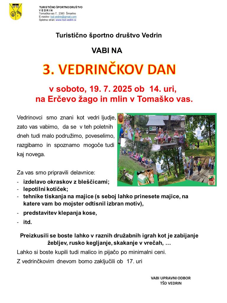 Kontaktni podatki organizatorja: Irena Kotnik, tsd.vedrin@gmail.com, 041 450 080.