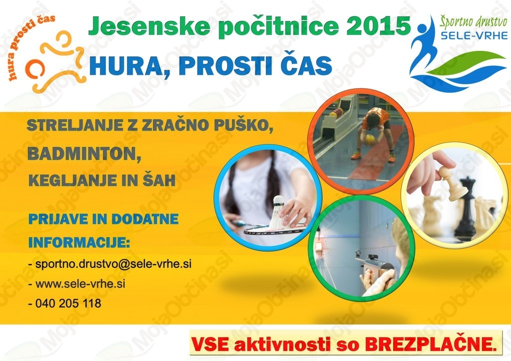 Športno društvo Sele-Vrhe bo v okviru projekta "Hura, prosti čas 2015" izvedla brezplačno vodeno vadbo za otroke v času jesenskih počitnic.