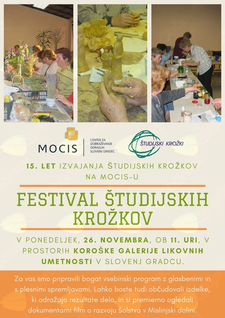 Vabimo na festival študijskih krožkov, ki se bo odvijal v ponedeljek, 26. novembra, ob 11. uri, v prostorih Koroške galerije likovnih umetnosti v Slovenj Gradcu.