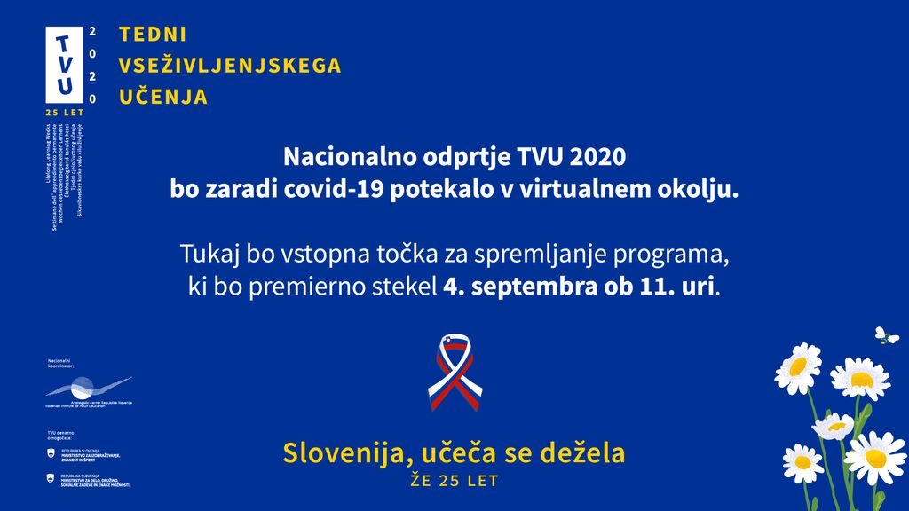 Vabimo vas torej, da nacionalno odprtje TVU spremljate 4. septembra ob 11. uri prek vstopne točke dogodka na spletišču TVU, FB TVU in drugih spletnih okolij. Prireditev bosta uvedla videoposlanica predsednika RS, gospoda Boruta Pahorja in ministrice za izobraževanje, znanost in šport, dr. Simone Kustec. V nadaljevanju bo spregovorilo 25 znanih in manj znanih osebnosti, zvestih privržencev vseživljenjskega učenja. Njihove izjave bo podprla premierno predvajana himna Moč in radost v izvedbi reperja Zlatka. Program bo trajal dobro uro, kasneje pa bo na voljo kot celota in po sestavnih delih prek spletne strani TVU.