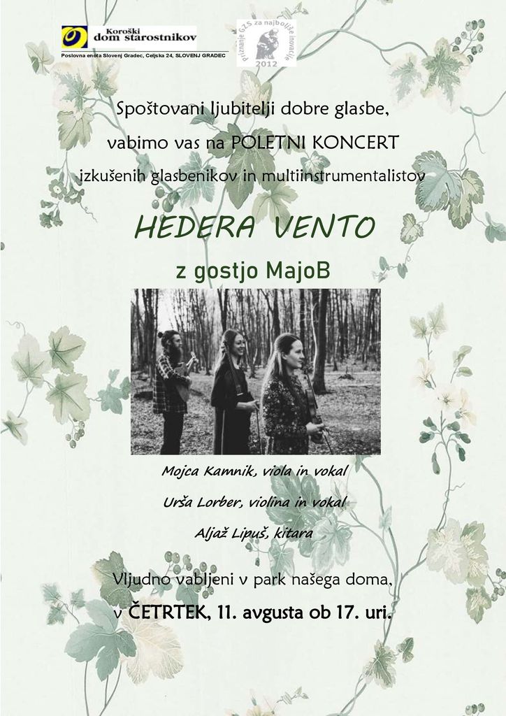 Vsi ljubitelji dobre glasbe vljudno vabljeni na poletni koncert zasedbe Hedera Vento z gostjo MajoB.