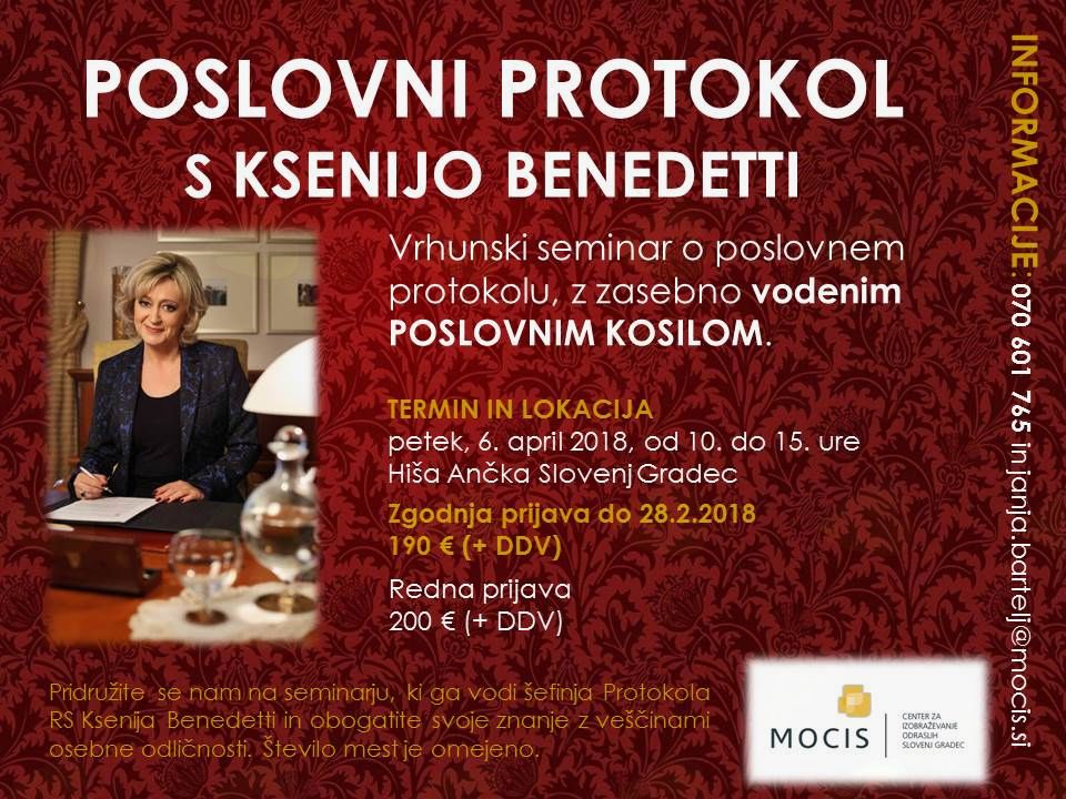 Vrhunski seminar o poslovnem protokolu, kjer boste izvedeli vse, kar morate vedeti o sodobnem komuniciranju za uspešen in učinkovit poslovni nastop. Spoznali bomo poslovni bonton v praksi. Posebnost tega seminarja je zasebno vodeno poslovno kosilo z razlago gospe Ksenije Benedetti, šefinje Protokola Republike Slovenije.