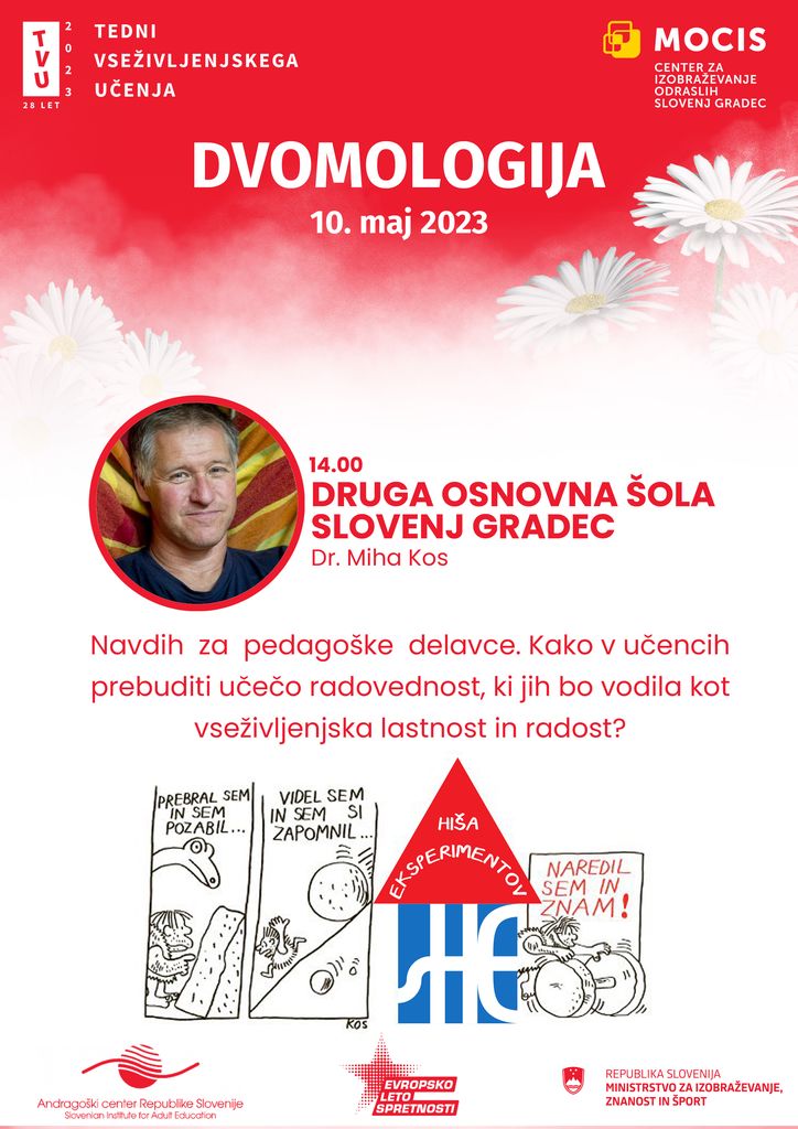 V Sloveniji imamo Hišo eksperimentov zaradi njega in njegove vizije, ki se mu je porodila pred približno tridesetimi leti. Dr. Miha Kos je s skupino še nekaterih somišljenikov, študijskih prijateljev, vpeljal v slovenski prostor eksperimente, fizikalne poizkuse in tudi poizkuse iz drugih ved, ki javnosti vseh generacij približujejo znanost in vabijo k radovednosti, k vse učeči družbi. V Hiši eksperimentov nočejo učiti, hočejo navduševati za učenje, pomagati, da se ljudje sami opolnomočimo na področju kritičnega sklepanja in razmišljanja.