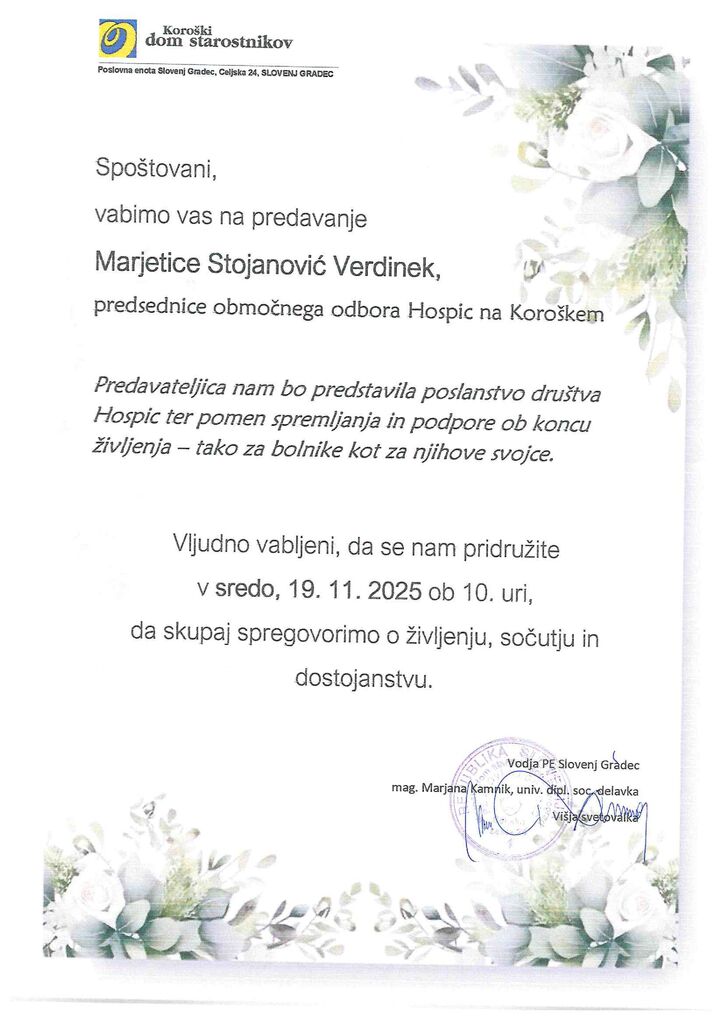 Predavanje Marjetice Stojanović Verdinek iz Društva Hospic