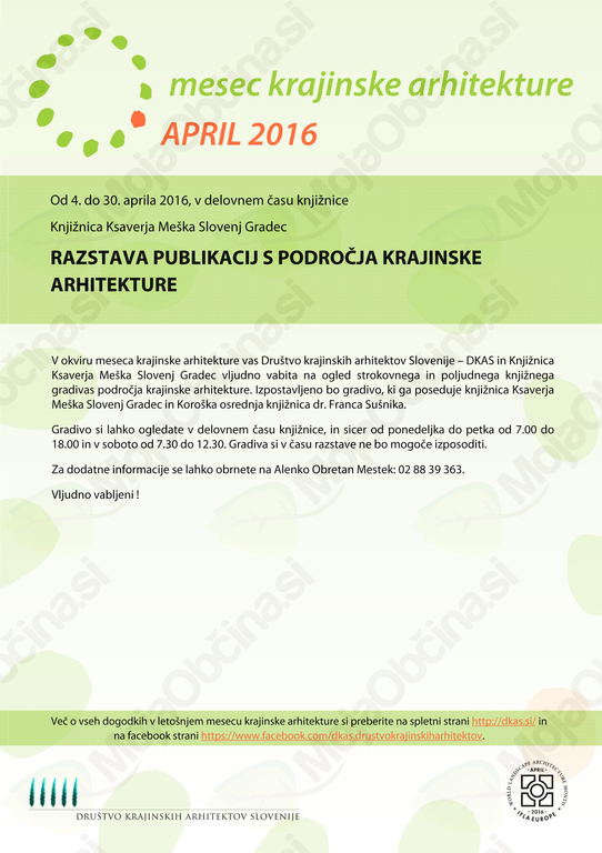 V okviru meseca krajinske arhitekture vas Društvo krajinskih arhitektov Slovenije – DKAS in Knjižnica Ksaverja Meška Slovenj Gradec vabita na ogled strokovnega in poljudnega knjižnega gradiva s področja krajinske arhitekture.