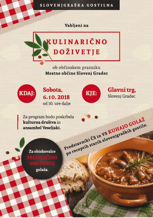 Kulinarična predstavitev vaških in četrtnih skupnosti MOSG ter predstavitev kulturnih društev in enot civilne zaščite. Vabljeni na okušanje domačih jedi in prijetno druženje ob programu na prireditvenem odru.