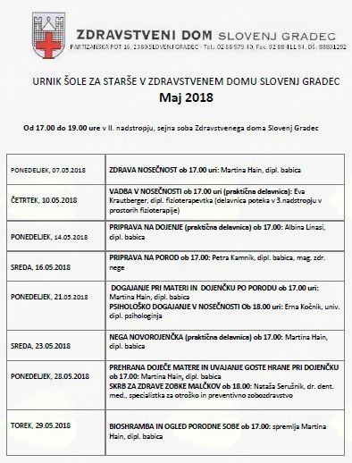 Zdravstveni dom Slovenj Gradec zagotavlja večkrat med letom bodočim staršem sodelovanje v Šoli za starše. Vabljeni na predavanja in delavnice, ki jih vodijo izkušene babice in diplomirane sestre, s katerimi se boste srečevali tudi ob negi vašega malčka po prihodu iz porodnišnice.