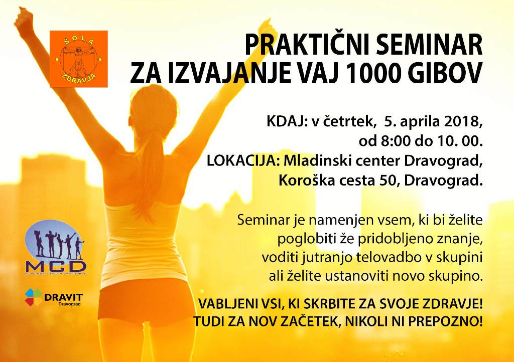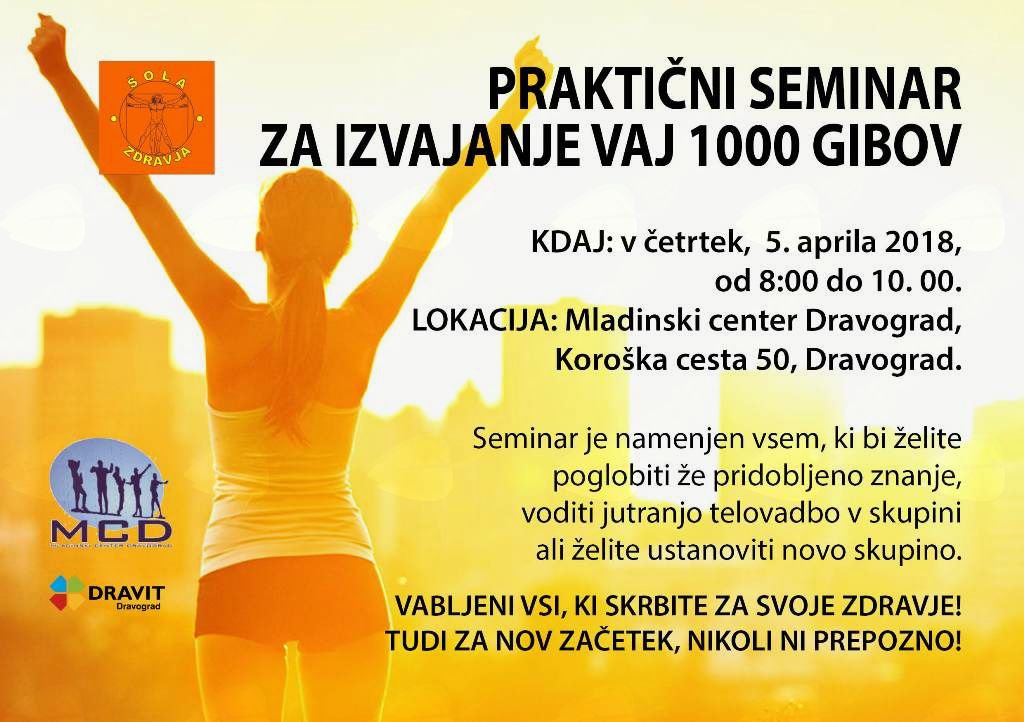 Jutranjo telovadbo, ki se že 4 leta izvaja na igrišču Robindvora želimo razširiti tudi v druge občine in hkrati povezati že obstoječe skupine. Za ta namen nas bo obiskala predsednica društva Šole zdravja Zdenka Katkič. Tokrat se bo jutranja telovadba pričela ob 8:00 pred Mladinskim centrom Dravograd. Zdenka bo prikazala pravilno izvajanje vsake posamezne vaje. Vadbe z nazivom »1000 gibov« se lahko udeleži vsak, tudi brez predhodne kondicije. Obvezno je le, da imate udobne oblačila za izvajanje vaj. Vabljeni!
