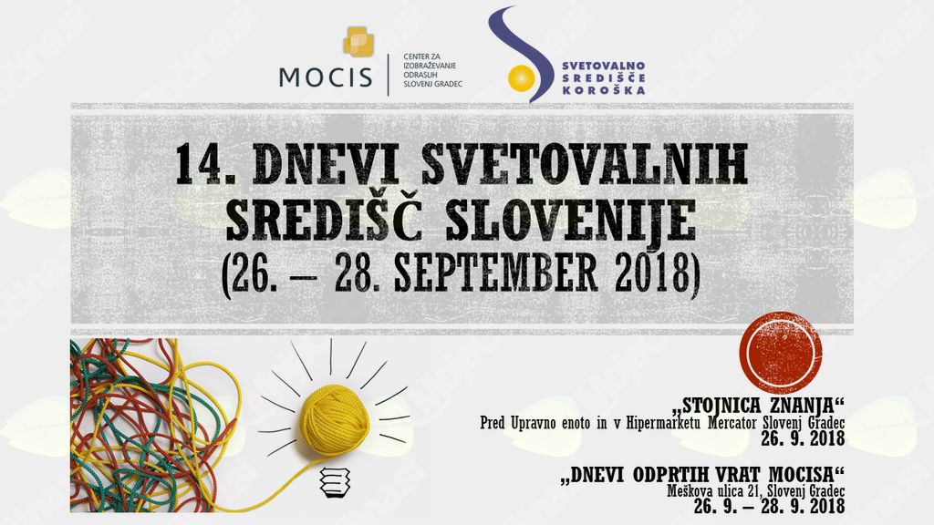V okviru 14. dnevov Svetovalnih središč Slovenije vas Svetovalno središče Koroška, v sredo, 26. septembra 2018, vabi na predstavitev MOCIS-ovih izobraževalnih programov in svetovalne dejavnosti. Najdete nas na »stojnicah znanja« pred Upravno enoto in v Hipermarketu Mercator Slovenj Gradec od 9. do 18. ure. Vljudno vabljeni! »Naj teče učenje skozi življenje!«