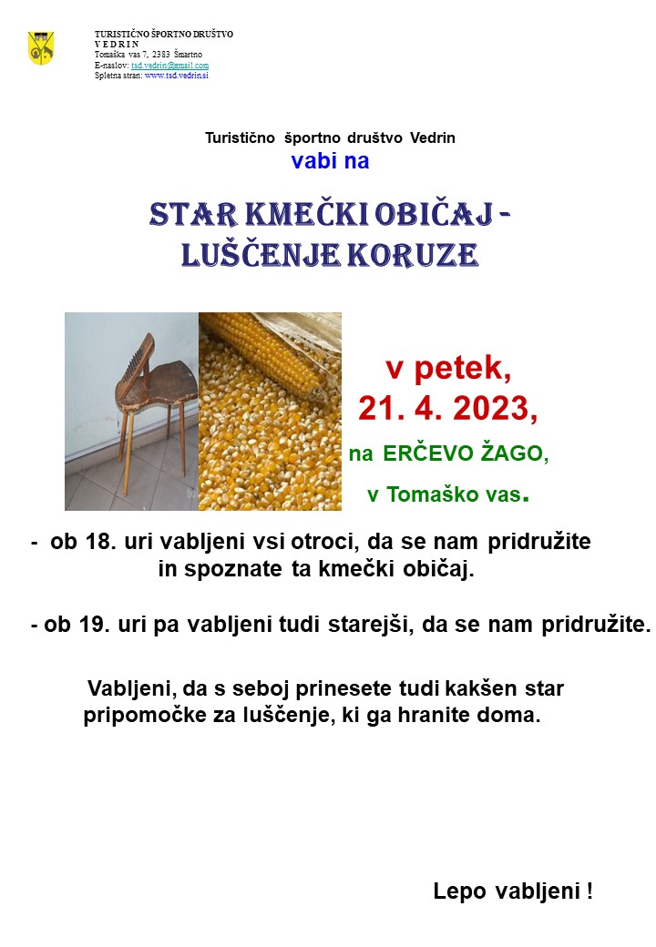 Turistično športno društvo Vedrin vabi na tradicionalno prireditev - predstavitev starega kmečkega običaja - LUŠČENJE KORUZE, ki bo v petek, 21. 4. 2023, na Erčevi žagi.