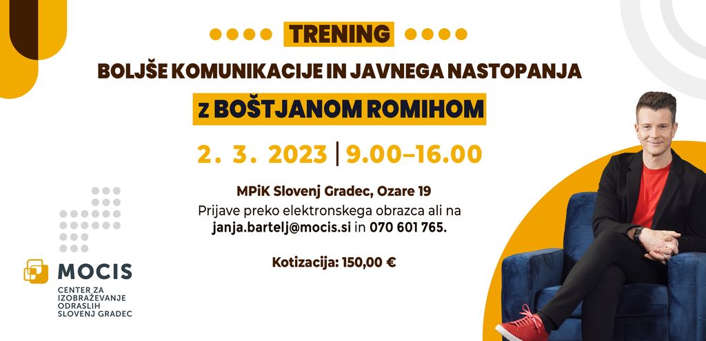 Kotizacija za udeležbo na seminarju znaša 150,00 €. Kotizacijo poravnajte ob prijavi na: MOCIS, Center za izobraževanje odraslih Slovenj Gradec, Meškova ulica 21, 2380 Slovenj Gradec, TRR SI56 0131 2603 0723 503.