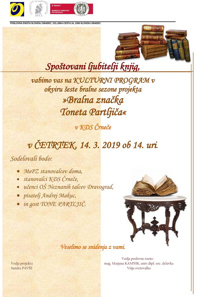 VABILO NA KULTURNI PROGRAM - BRALNA ZNAČKA TONETA PARTLJIČA