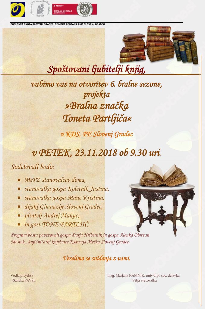VABILO na otvoritev 6. bralne sezone - BRALNA ZNAČKA TONETA PARTLJIČA