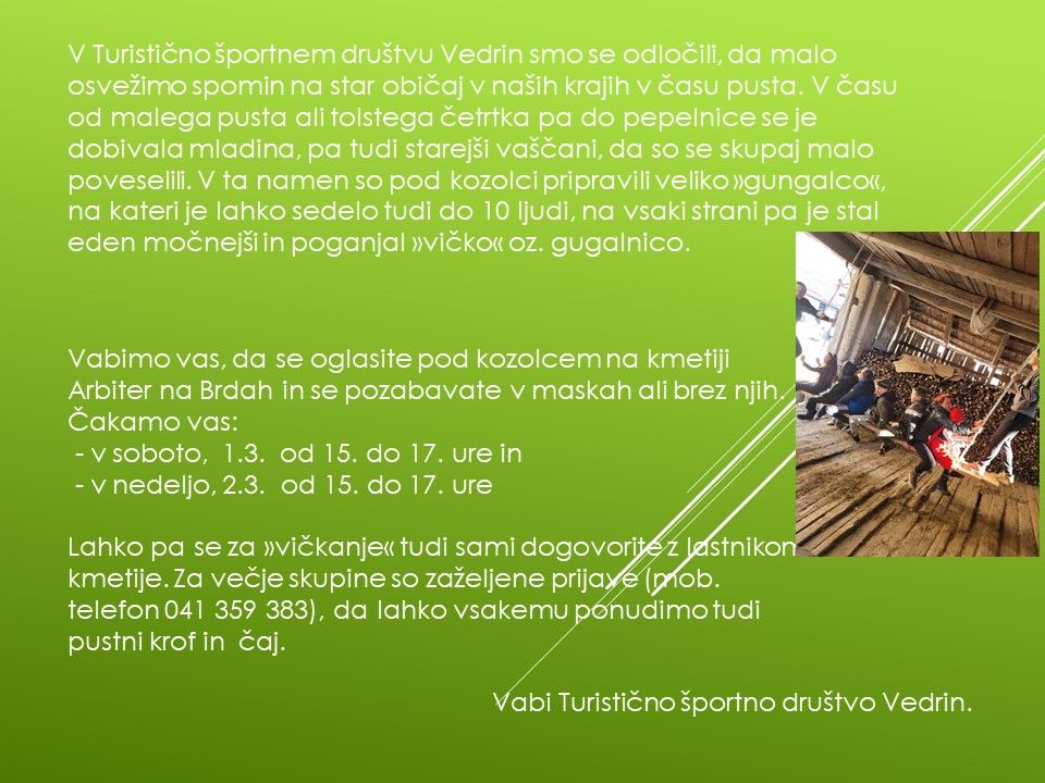 Kontaktni podatki organizatorja: Irena Kotnik, tsd.vedrin@gmail.com, 041 450 080.