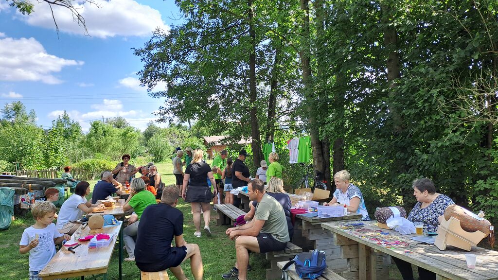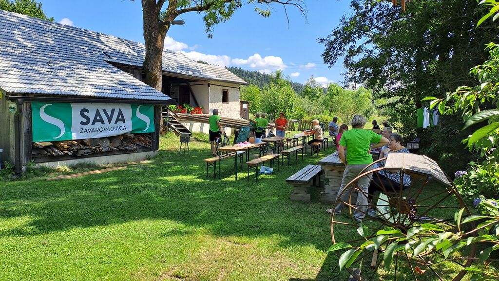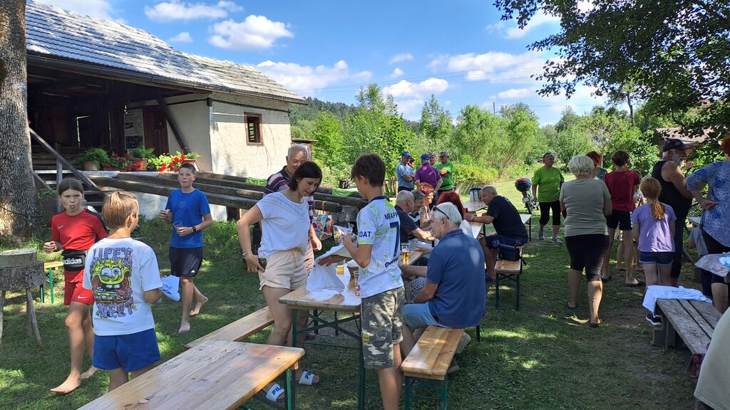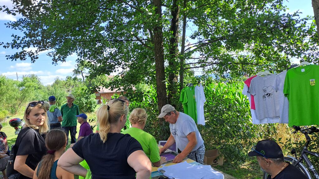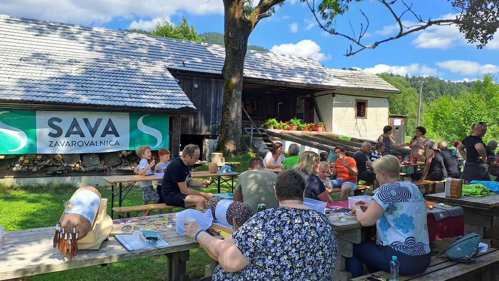 Idilična naravna kulisa je gostila vrsto delavnic in prikazov starih obrti. Med krošnjami dreves in ob zvoku vode so udeleženci ustvarjali različne okraske - za delavnico sta poskrbeli naši članici Vlasta Matavž -VM design ter Irena. Udeleženci so se družili, učili in preprosto uživali v lepem poletnem dnevu. Ena od osrednjih točk dneva je bil prikaz klepanja kose, kjer so obiskovalci lahko pobliže spoznali to tradicionalno spretnost. Branko je z urnimi in natančnimi gibi sklepal kar nekaj kos. Naša Zdenka pa je s ponosom predstavila umetnost klekljanja – od fine niti do čudovitih čipkastih izdelkov. Mnogi obiskovalci, tako mlajši kot starejši, so z zanimanjem poprijeli za klekeljne in prvič poskusili ustvariti droben vzorček. Največ "gužve" pa je bilo seveda pri tiskanju različnih motivov na majice, za kar so poskrbeli mojster Marjan ter pomočnici Dragica in Milena. Obiskovalci so se ustavili tudi ob lepotilnem kotičku ali pa so se lahko pomerili v različnih zabavnih igrah: tekmovanju v zabijanju žebljev v tnalo, skakanju v vrečah, hoji s hoduljami in še marsičem. Smeh in dobra volja sta odmevala med drevesi. Za okrepčilo so poskrbeli Vedrinovci – obiskovalci so se lahko odžejali s hladno pijačo, želodčke pa so napolnili z okusnimi domačimi hrenovkami in domačimi klobasami kmetije Vranjek, ki so zadišale daleč naokrog.