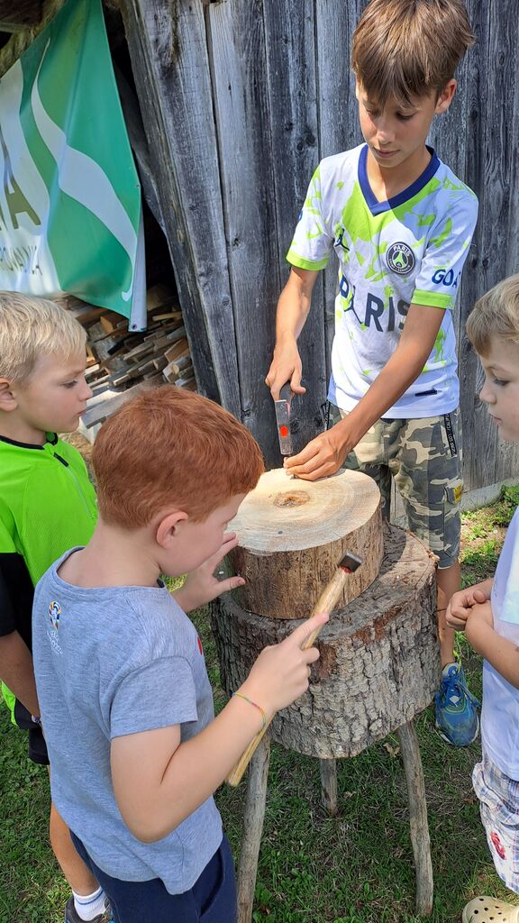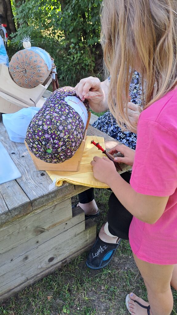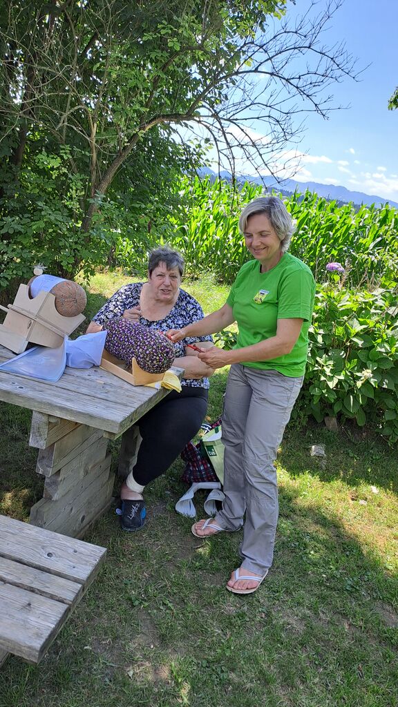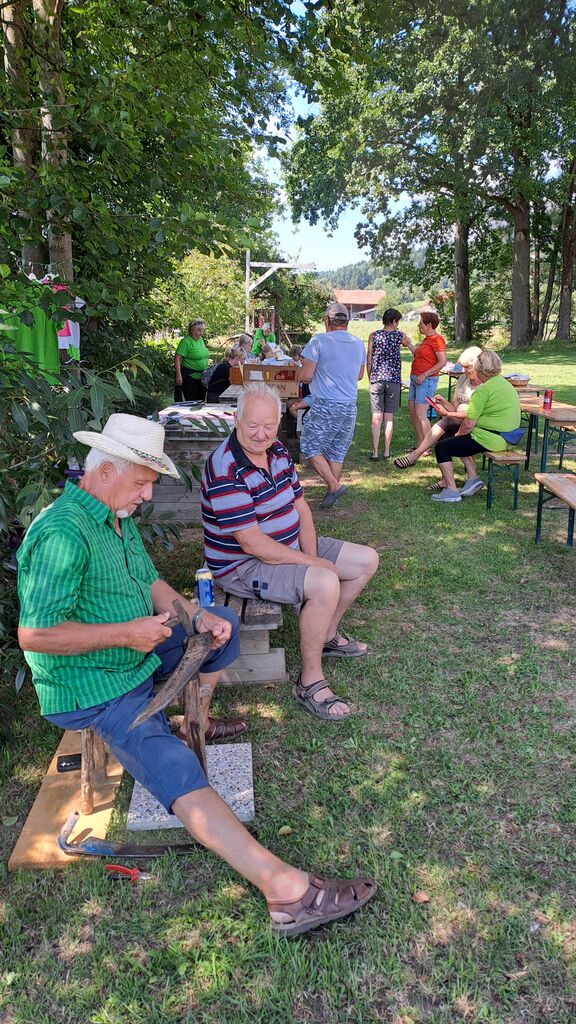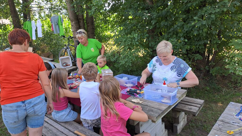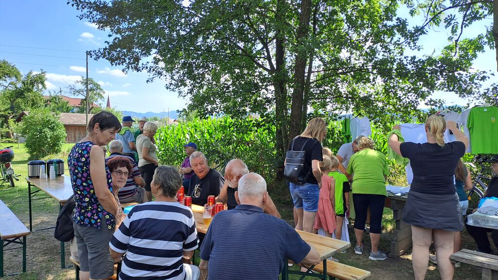 Idilična naravna kulisa je gostila vrsto delavnic in prikazov starih obrti. Med krošnjami dreves in ob zvoku vode so udeleženci ustvarjali različne okraske - za delavnico sta poskrbeli naši članici Vlasta Matavž -VM design ter Irena. Udeleženci so se družili, učili in preprosto uživali v lepem poletnem dnevu. Ena od osrednjih točk dneva je bil prikaz klepanja kose, kjer so obiskovalci lahko pobliže spoznali to tradicionalno spretnost. Branko je z urnimi in natančnimi gibi sklepal kar nekaj kos. Naša Zdenka pa je s ponosom predstavila umetnost klekljanja – od fine niti do čudovitih čipkastih izdelkov. Mnogi obiskovalci, tako mlajši kot starejši, so z zanimanjem poprijeli za klekeljne in prvič poskusili ustvariti droben vzorček. Največ "gužve" pa je bilo seveda pri tiskanju različnih motivov na majice, za kar so poskrbeli mojster Marjan ter pomočnici Dragica in Milena. Obiskovalci so se ustavili tudi ob lepotilnem kotičku ali pa so se lahko pomerili v različnih zabavnih igrah: tekmovanju v zabijanju žebljev v tnalo, skakanju v vrečah, hoji s hoduljami in še marsičem. Smeh in dobra volja sta odmevala med drevesi. Za okrepčilo so poskrbeli Vedrinovci – obiskovalci so se lahko odžejali s hladno pijačo, želodčke pa so napolnili z okusnimi domačimi hrenovkami in domačimi klobasami kmetije Vranjek, ki so zadišale daleč naokrog.