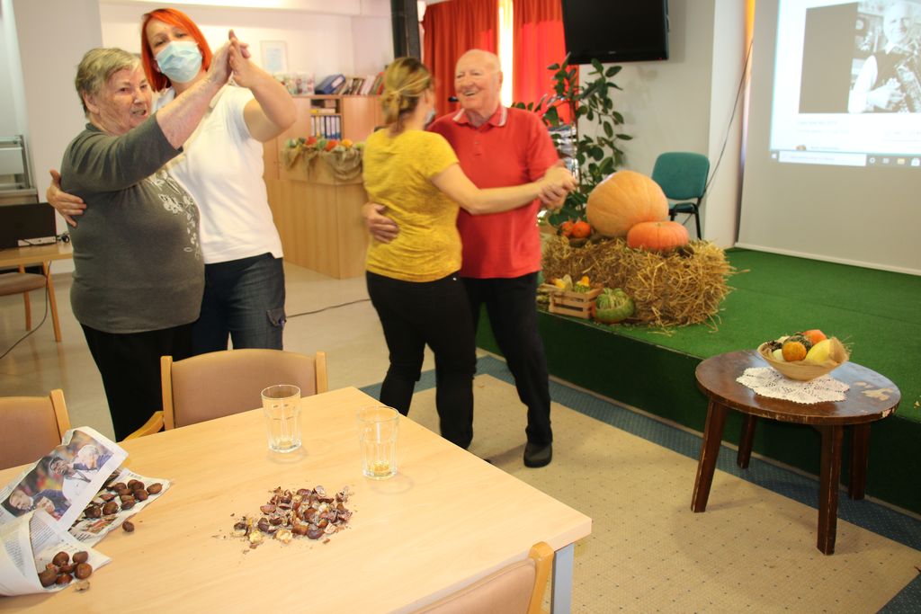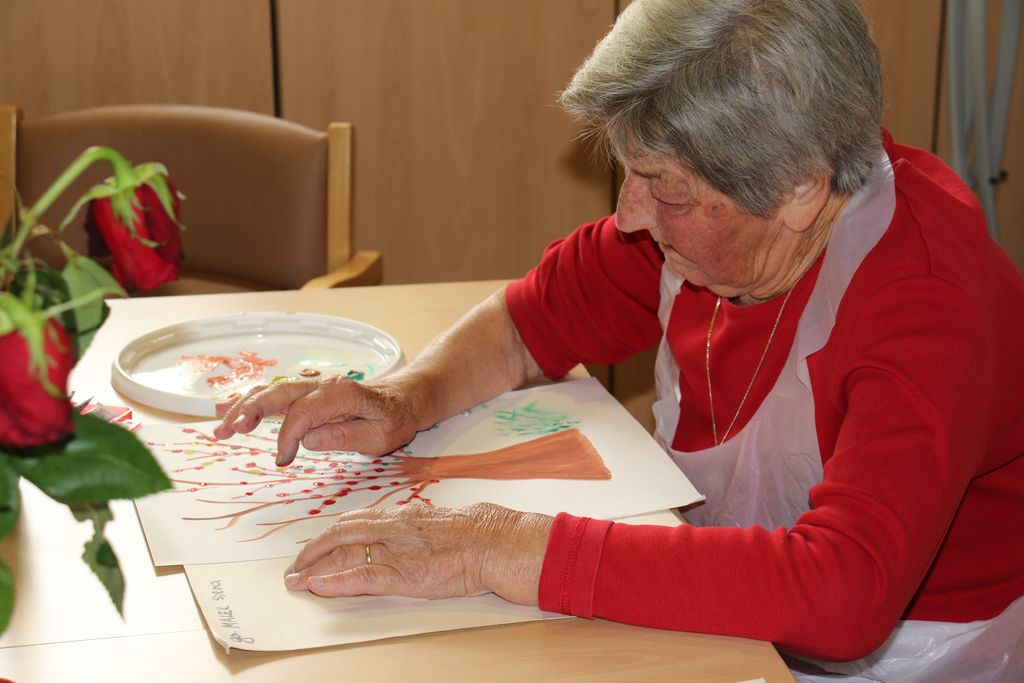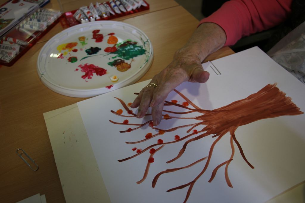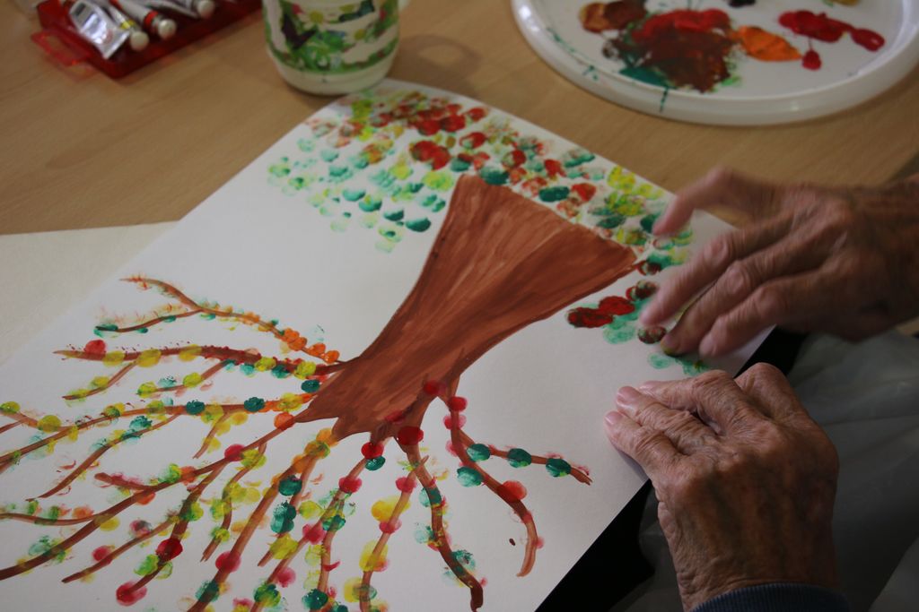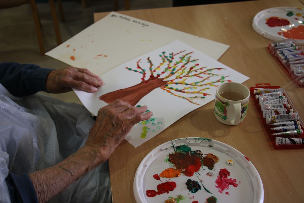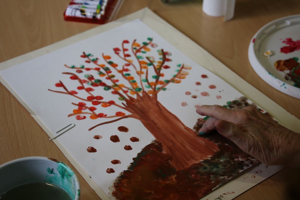 Ob številnih dejavnostih, ki so na voljo stanovalkam in stanovalcem je tudi delovna terapija med tistimi, ki ustvarjalno in polno bogati življenje v domu. Jesen smo si naslikali tudi sami, pri čemer smo uporabljali tudi prste, saj smo z njimi barvali jesenske krošnje dreves.