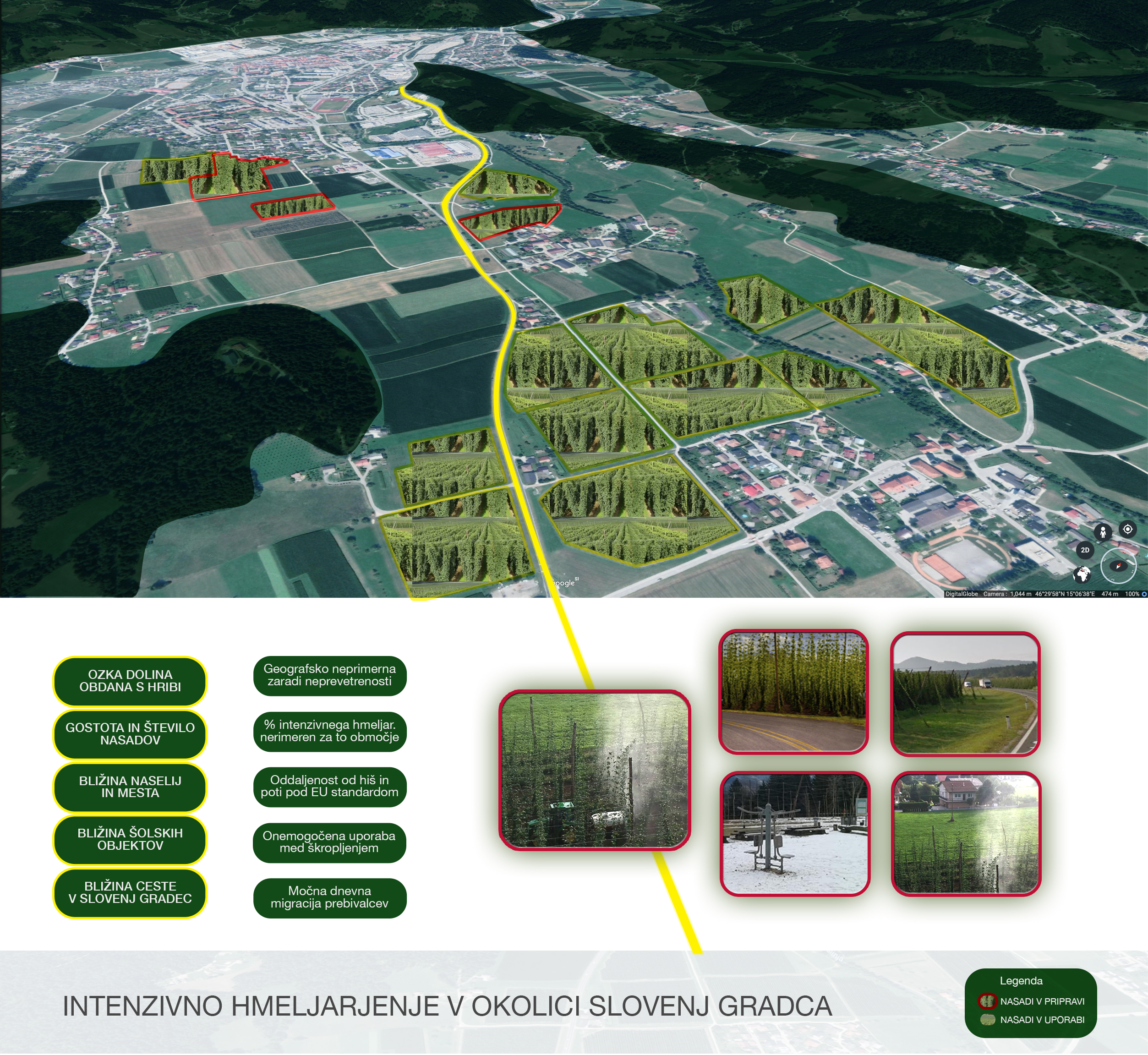 3. Specifične klimatske razmere Mislinjske doline so neprimerne za škropljenje, saj sta zanjo značilni stalna visoka zračna vlaga ter neprevetrenost, kar povzroča zastajanje vlažnega (kontaminiranega) zraka na dnu doline. Zaradi tega škropivo ob neugodnih vremenskih razmerah zanaša več sto metrov in celo kilometre daleč po dolini, spotoma pa se ostanki FFS v zraku počasi odlagajo na površje in tam v obliki prašnih delcev tudi ostajajo. Prav zaradi tega je konvencionalno gojenje hmelja z izjemno visokimi nasadi še posebej sporno. Posnetek škropljenja si lahko ogledate na povezavi: https://www.youtube.com/watch?v=gPDqcMRp7Tc. Naša mala, ozka in z vseh stani zaprta dolina je popolnoma neprimerna za tako številčne nasade z monokulturo.