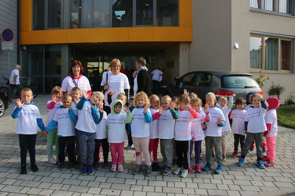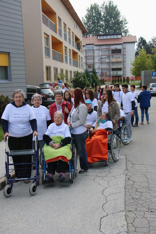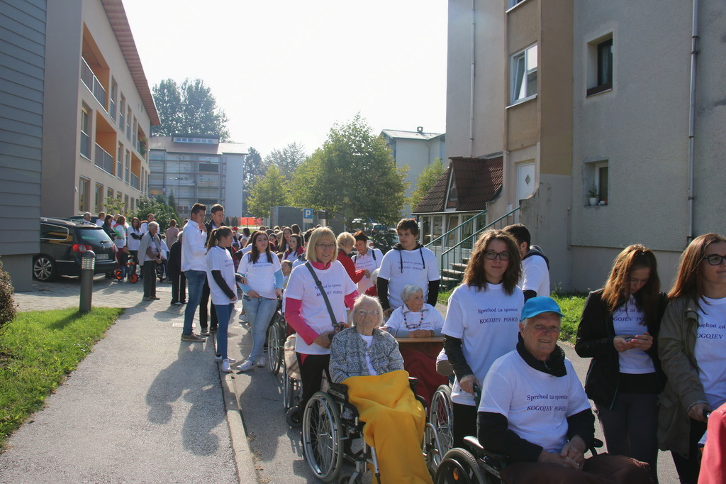 Letošnji Kogojev pohod "Sprehod za spomin" je bil že drugi po vrsti. Z njim stanovalci in zaposleni v Poslovni enoti Slovenj Gradec prispevamo k ozaveščanju okolja o Alzheimerjevi bolezni, najpogostejši obliki demence. Pomembno je, da prve znake njenega pojava prepozna čimveč ljudi vseh generacij. Zato so se povabilu odzvali še dijaki gimnazije in srednje zdravstvene šole, člani Pum-a, otroci iz vrtca Slovenj Gradec in prostovoljke v PE Slovenj Gradec. Skupaj nas je bilo 114.