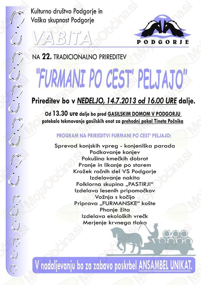 V nedeljo, 6. julija, se bodo na igrišču na mivki ob 15. uri pomerile mešane trojke v odbojki na mivki. V ponedeljek, 7. julija, se bo na tenis igriščih v Podgorju odvijal teniški turnir, v torek, 8. julija, pa ob 17. uri turnir v odbojki za moške v športni dvorani OŠ Podgorje. V sredo, 9. julija. ob 17. uri vabljeni na balinišče v Podgorju, v četrtek, 10. julija, pa k udeležbi in ogledu turnirja v odbojki za ženske, ki bo ob 17. uri v šolski športni dvorani. V petek, 11. julija, bo ob 16. uri na lovski koči potekalo streljanje z malokalibrsko in zračno puško, v soboto, 12. julija, ob 14. uri pa pred gasilskim domom v Podgorju gasilsko tekmovanje za prehodni pokal Tineta Pečnika ter ob 18. uri turnir v malem nogometu na igrišču pred OŠ Podgorje. V nedeljo, 13. julija, vabljeni na osrednjo prireditev ob prazniku Vaške skupnosti Podgorje 'Furmani po cest' peljajo', ki se bo začela ob 15. uri na športnem igrišču pred OŠ Podgorje.