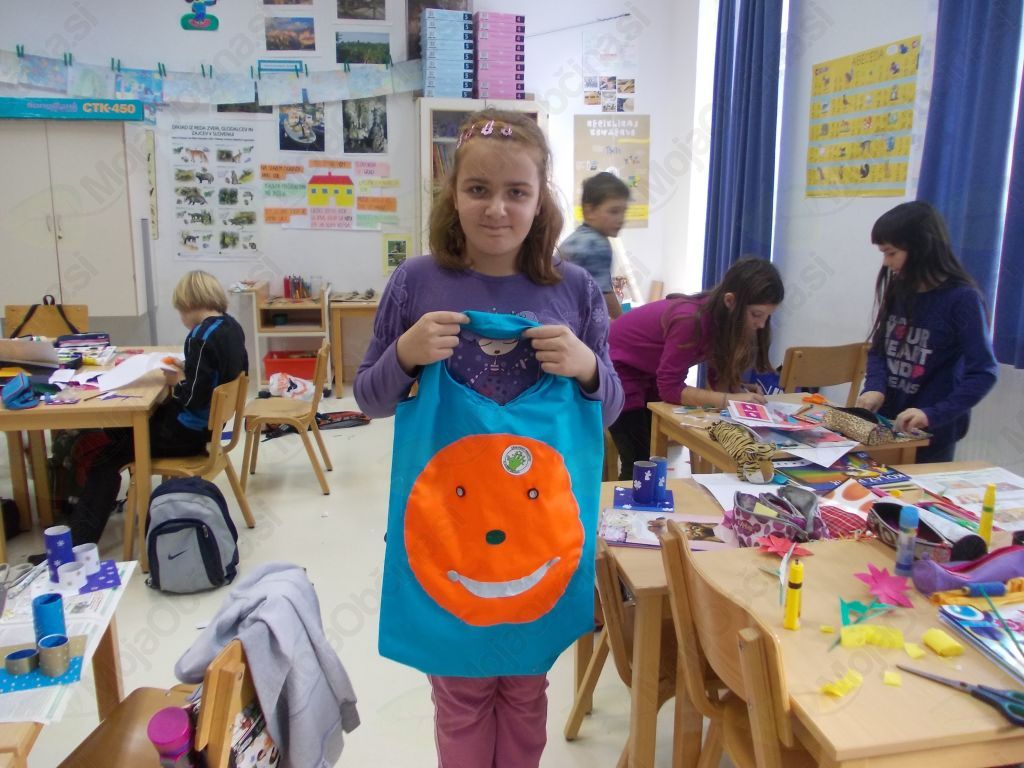 Učenci (50) so se razdelili v skupne in z mentoricami izdelali vsak svojo trajno vrečko. Vrečko so s pomočjo skrojili, šivilje so jo sešile, učenci pa so jih vsak po svoji domišljiji okrasili.