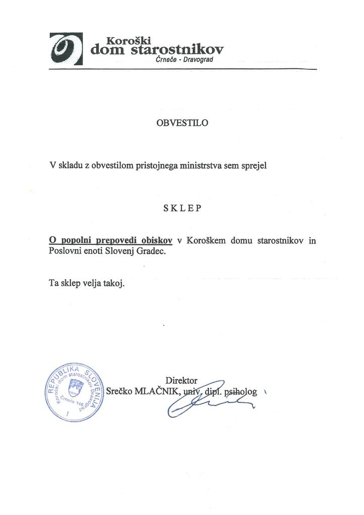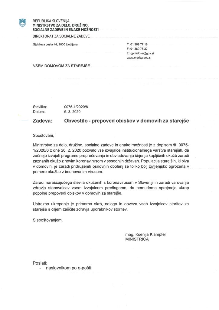 Zaradi naraščajočega števila okuženih s koronavirusom v Sloveniji in zaradi varovanja zdravja stanovalcev vsem izvajalcem predlagamo, da nemudoma sprejmejo ukrep popolne prepovedi obiskov v domovih za starejše.