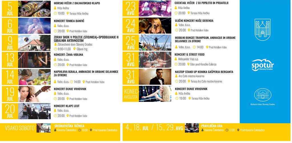 Mestna občina Slovenj Gradec in Javni zavod Spotur sta se povezala z lokalnimi ponudniki gostinskih storitev iz mestnega jedra in skupaj smo pripravili zanimiv program, ki bo zadovoljil vse okuse in različne generacije ter bo potekal na raznih lokacijah v mestnem jedru Slovenj Gradca ob vikendih vse do konca poletja. Program bo dopolnil prireditve v okviru Slovenjegraškega poletja, ki ga tudi letos organizira Kulturni dom Slovenj Gradec v sodelovanju z Mestno občino Slovenj Gradec.
