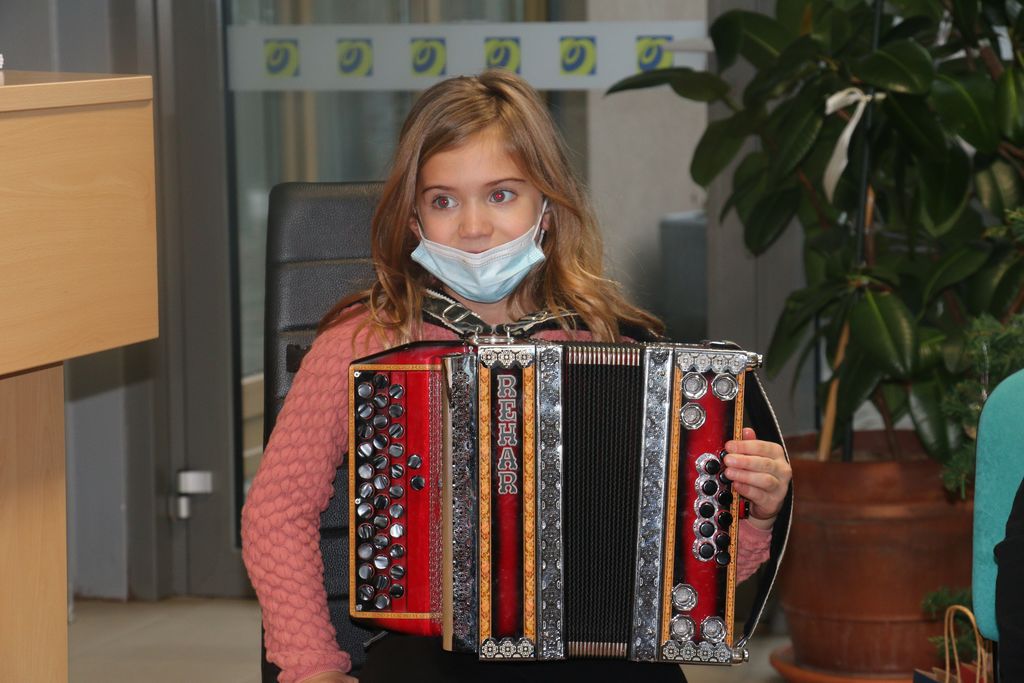 Vsa prejeta darila še polepšala učenka Julija Hovnik s prisrčnim igranjem na harmoniko in prisrčnimi voščilnicami, ki jih je napisala skupaj s svojim bratom Ninom.