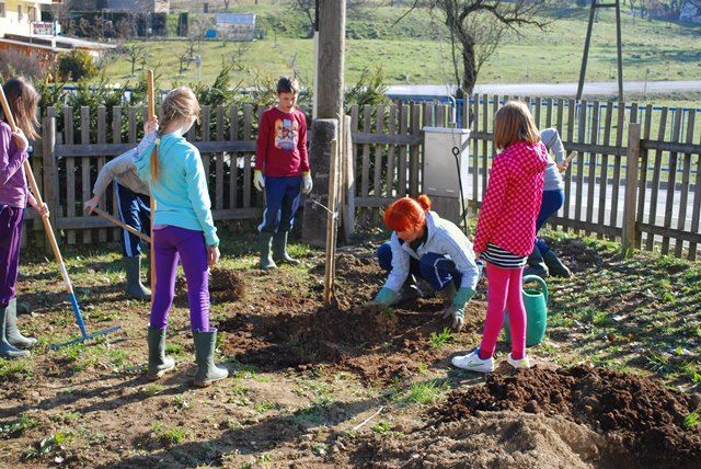 Ker je vreme v letošnji pomladi zelo lepo, smo se najprej lotili sadovnjaka, da zapolnimo vrzel pred šolo. Pri načrtu mi je pomagal gospod Miha Kanop, član društva Ajda, ki je poskrbel tudi za ustrezne sadike sadnega drevja in grmičevja. Ker vsaka sadika bolje raste, če je pognojena, je za biološko gnojilo poskrbel gospod Krajnc.