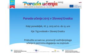 V okviru Tedna vseživljenjskega učenja bomo na MOCIS-u od 15. 5. do 23. 6. 2015 organizirali 13 različnih brezplačnih delavnic in dogodkov.  Najprej bi vas v ponedeljek, 18. maja od 10. do 15. ure povabili na Trg svobode v Slovenj Gradcu, kjer se bo odvijala letošnja Parada učenja. Parada učenja - dnevi učečih se skupnosti je obogatitev projekta Teden vseživljenjskega učenja (TVU), ki jo je omogočil projekt Uresničevanje prenovljenega Evropskega programa za učenje odraslih (EPUO) v Sloveniji.