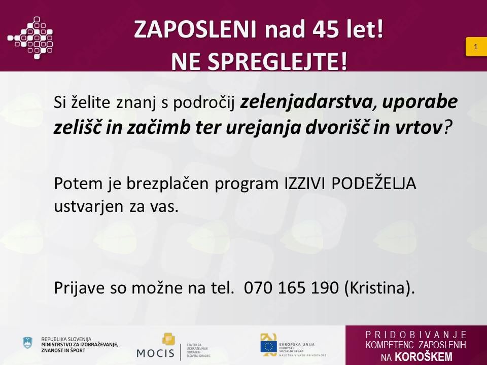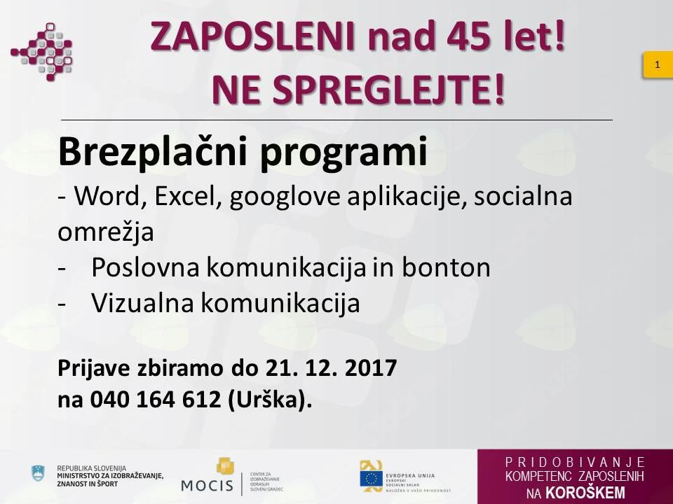 V okviru projekta Pridobivanje kompetenc zaposlenih, ki ga izvajamo skupaj s partnerji Smeri, A.L.P Peca in Srednja šola Ravne, vas obveščamo, da so na voljo še prosta mesta za vključitev v različne neformalne izobraževalne programe za odrasle.