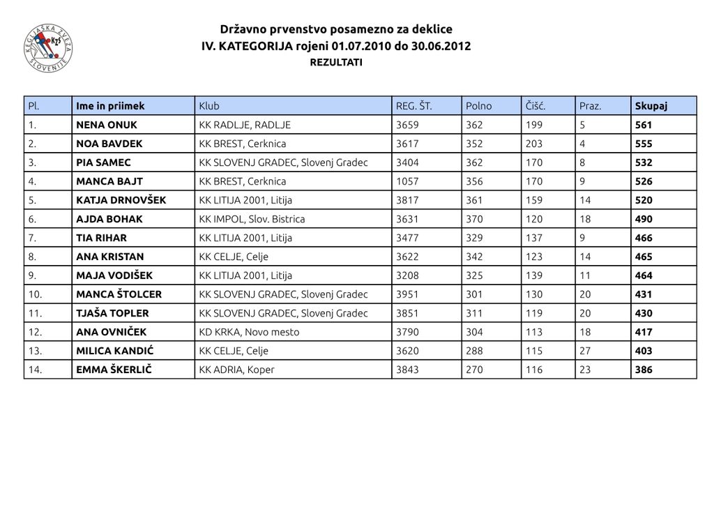 Pri deklicah je Pia Samec v 4. kategoriji podrla 532 kegljev in se uvrstila po prvem nastopu na 3. mesto. Dober rezultat, vendar za njo veliko premalo. Morali bomo delat na psihološki pripravi in bo brez problema prevzela 1. mesto. Ko je na stezi, se preveč ukvarja s stvarmi ki so izven steze, kot pa s kegljanjem na stezi.